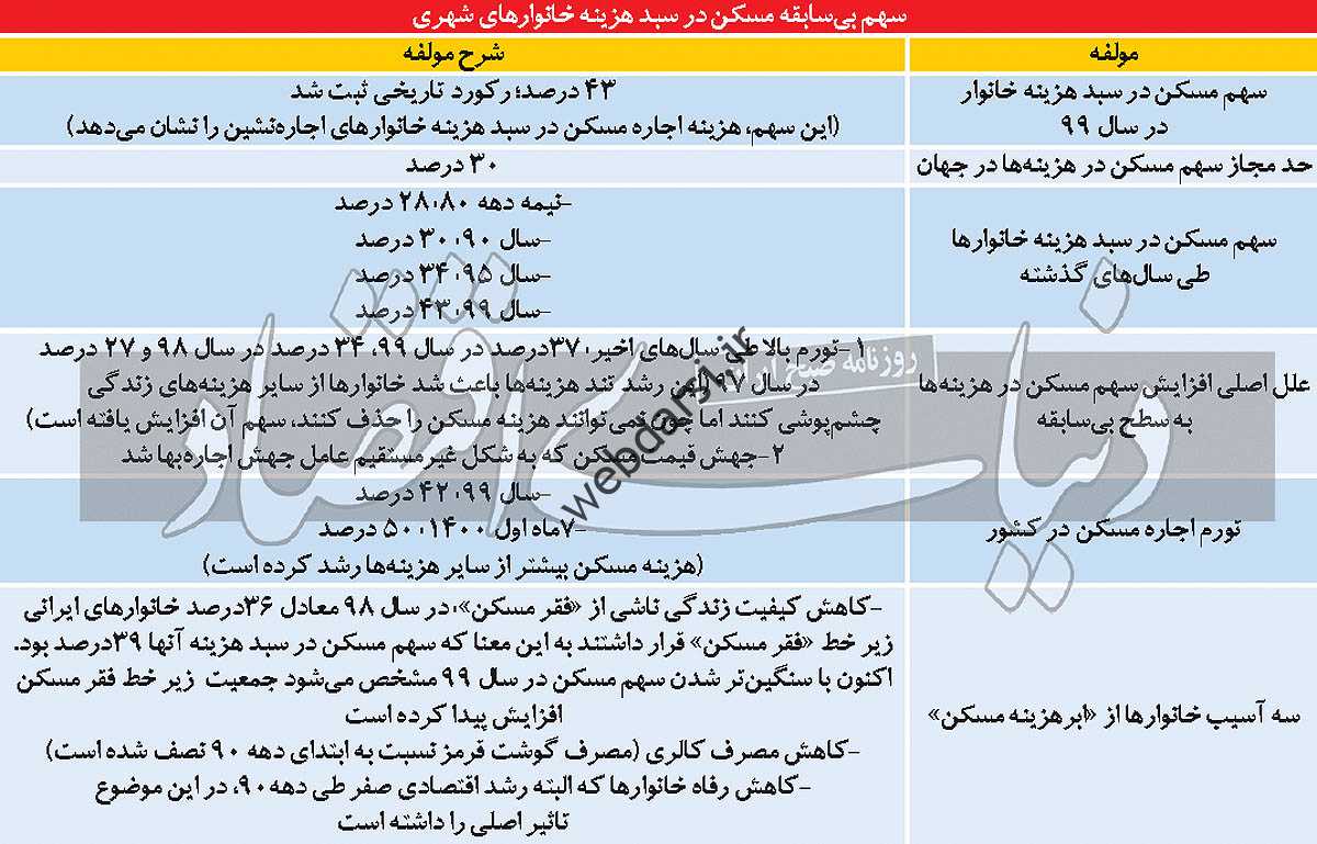 آخرین اطلاعات از اشتراک اقلام مختلف در سبد مصرفی خانوارهای شهری نشان می دهد که اجاره بها در عصر کنونی گران شده است. طبق آمار، سهم مسکن از درآمد خانوارها به 1.3 برابر «حد مجاز» رسیده است. بر اساس آخرین داده ها در مورد توزیع نابرابری های مختلف در لوازم خانگی، اجاره بها در شهر در سال 1378 43 درصد افزایش یافته است که این آمار تاریخی نسبت به وزن مسکن در سبد مصرفی است.